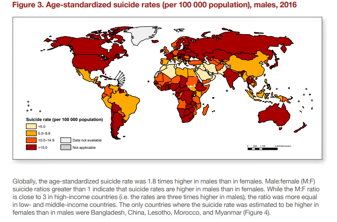 Presque partout dans le monde, le taux de mortalité par suicide est plus élevé chez les hommes sauf que le Maroc figure dans le classement des cinq pays où le taux de suicide chez les femmes est plus élevé que chez les hommes. Dans le même classement, on trouve aussi Bangladesh, la Chine, le Lesotho et le Myanmar.