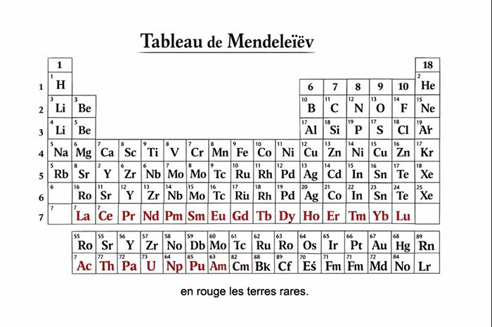 • Lanthanides (15) : lanthane (La), cérium (Ce), praséodyme (Pr), néodyme (Nd), prométhium (Pm), samarium (Sm), europium (Eu), gadolinium (Gd), terbium (Tb), dysprosium (Dy), holmium (Ho), erbium (Er), thulium (Tm), ytterbium (Yb), lutécium (Lu)