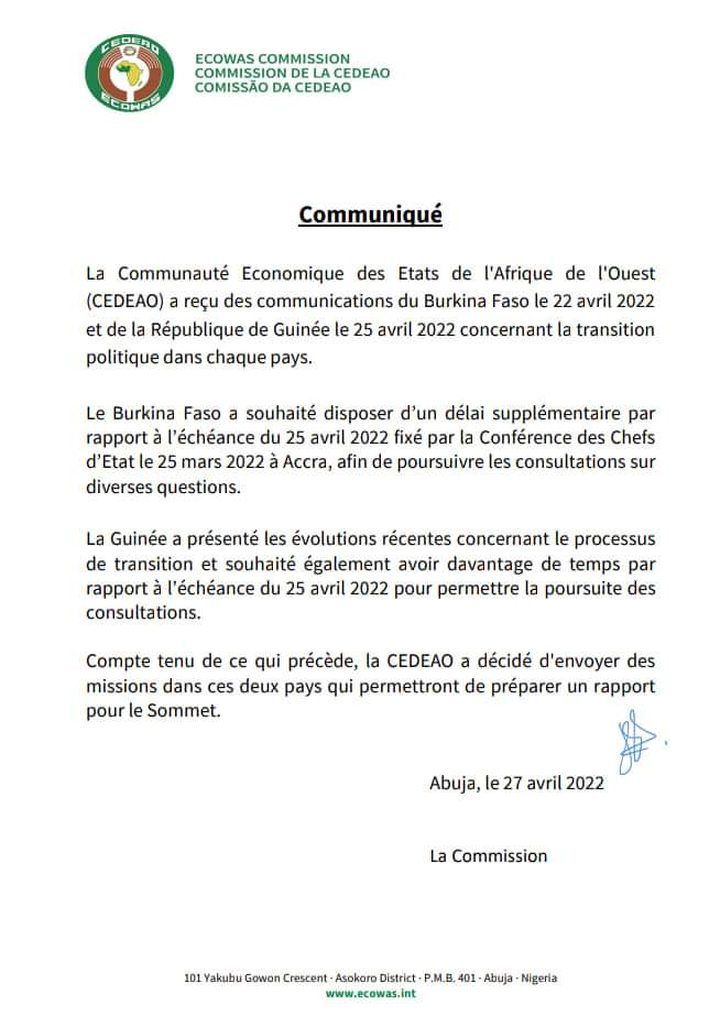Le Burkina Faso et la Guinée demandent un délai supplémentaire par rapport à l’échéance fixé par la CEDEAO.