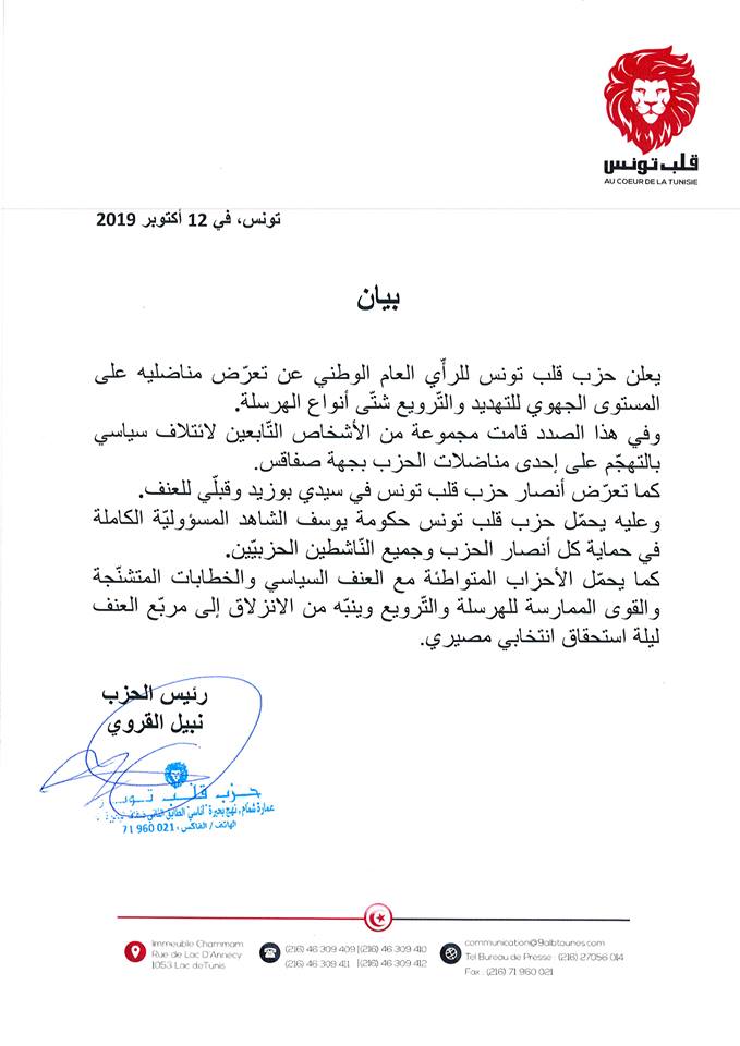 Sur un autre plan, 9alb Tounes prévient les partis politiques adeptes de la violence et des agressions, du danger de conduire le pays vers le carré de la violence politique la veille d’un scrutin de très haute importance.