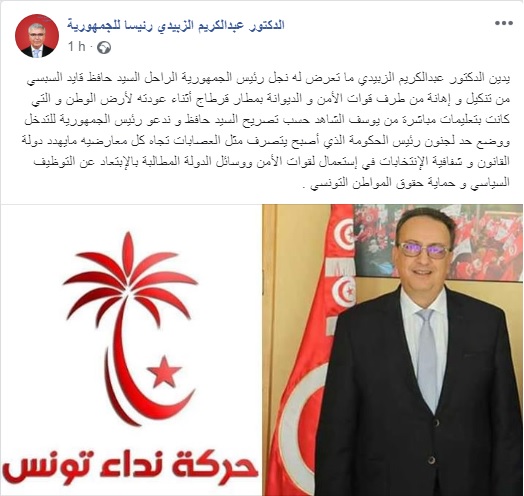 Selon la page de la campagne électorale d’Abdelkarim Zebidi, le candidat à la présidentielle aurait condamné le comportement humiliant des agents des douanes, à l’encontre de Hafedh Caïd Essebsi, à l’aéroport de Tunis Carthage.