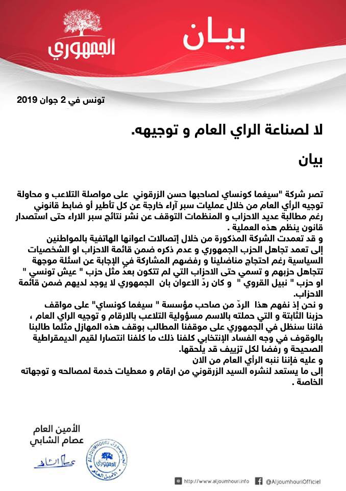 Le communiqué signé par Issam Chebbi, Secrétaire général d’Al Joumhouri, avertit les citoyens sur la supposée véracité des chiffres que va annoncer incessamment Sigma Conseil, pour ce mois !