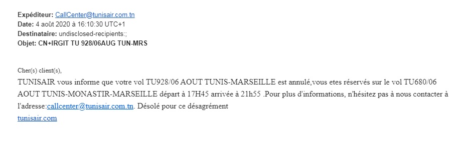 La dernière frasque du transporteur national date de lundi dernier, le 3 août, quand la compagnie a envoyé des mails à partir de la boite de son call centre à ses clients devant embarquer sur le vol TU 928 du 6 août, reliant Tunis à Marseille, pour les informer qu’il y a eu un changement au programme. La compagnie a, en effet, informé ses clients, en les mettant devant le fait accompli et en choisissant et décidant pour eux, sans leur donner une possibilité de réponse, qu’ils vont devoir prendre un vol qui devait faire un « petit crochet » par Monastir, avant de faire route vers Marseille.