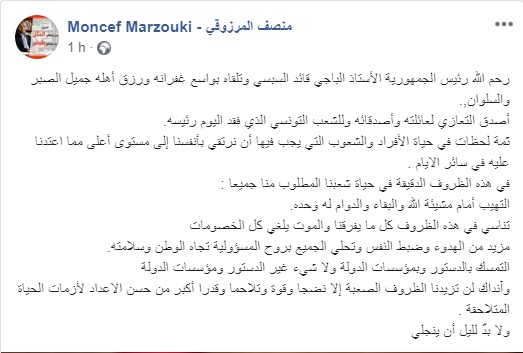 L’ex-président provisoire de la République, Mohamed Moncef Marzouki a réagi à l’annonce du décès du président Béji Caïed Essebsi, en présentant ses condoléances à la famille, aux proches du défunt, et à tout le peuple tunisien.