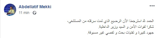 Le ministre de la Santé, Abdellatif Makki, a annoncé, il y a quelques minutes, à travers un post publié sur sa page Facebook, que le nouveau né enlevé il y a quelques jours à l’hôpital Wassila Bourguiba à Tunis, a été retrouvé. Makki a tenu à remercier les forces de sécurité intérieure et le ministre de l’Intérieur, pour les efforts déployés. Il a même parlé de moyens de détection utilisés pour la première fois.