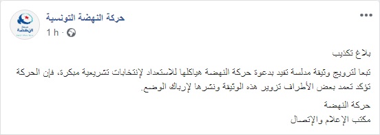 Le bureau de la communication et de l’information d’Ennahdha a publié, ce vendredi, un communiqué pour assurer que le document qui circule sur les réseaux sociaux et qui est attribué à la direction du parti, dans lequel elle demande aux partisans de se préparer à des élections anticipées, est un faux et que le parti n’a jamais émis ce document.