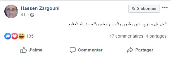 Devant le tumulte général qu’il a réussi à susciter, Hassan Zargouni n’a pas froid aux yeux et s’en va même, dans le sens de l’escalade, en faisant prévaloir son immense science et en traitant, au passage ses détracteurs d’ignorants. Et ce, à travers un post qu’il vient de publier sur sa page Facebook. Il répond à ceux qui sont mécontents de ses sondages par un verset du Saint Coran, en assurant que ceux qui savent et ceux qui sont ignorants ne peuvent jamais être égaux !