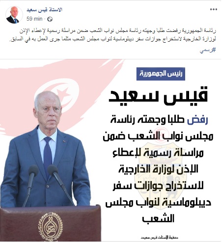 Cette fois-ci, Kaïs Saïed a refusé de répondre à cette requête, assurant que cette habitude de doter les députés de passeports diplomatique n’a aucun support légal et n’est régie par aucun texte de loi.