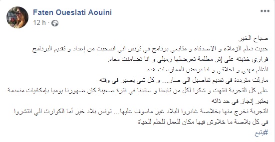 La journaliste Faten Oueslati, qui anime l’émission quotidienne sur la première chaine nationale de TV, « Fi Tounes » a posté sur son mur qu’elle venait de quitter son travail. Et ce en solidarité avec un de ses collègues qui venait d’être victime d’une injustice au travail. Elle a ajouté qu’”ils” n’ont laissé aucun endroit dans ce pays pour pouvoir y vivre. Elle a fini par inviter les tunisiens à quitter le pays, au plus vite, et sans avoir de regrets !