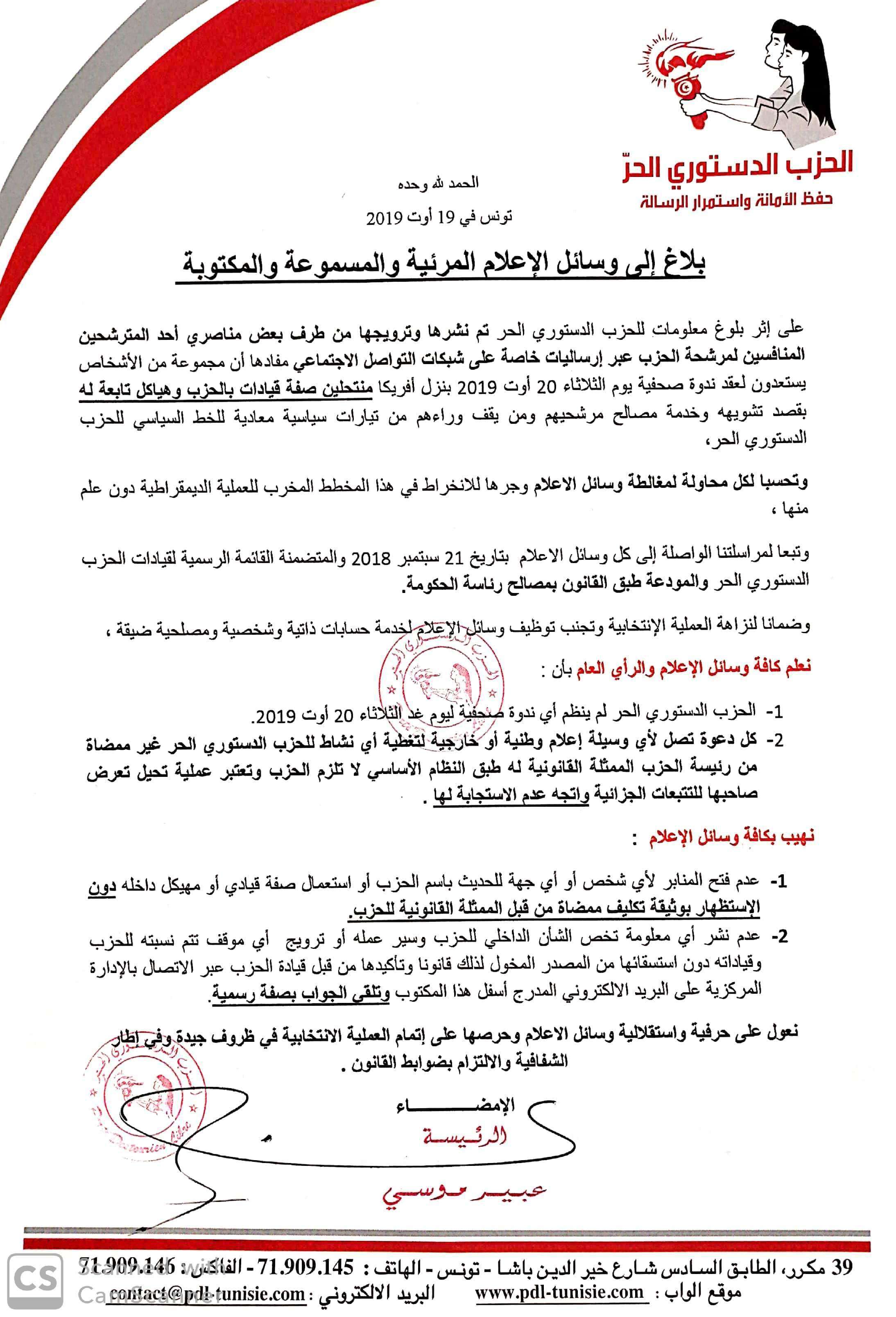La présidente du Parti Destourien Libre, Abir Moussi, a annoncé, ce lundi, à travers un communiqué adressé aux organes de presse, qu’il lui était parvenu qu’un groupe de personnes se faisant passer pour des leaders dans le PDL, ont annoncé que le parti organisait, demain, mardi, une conférence de presse, dans un hôtel de la Capitale.