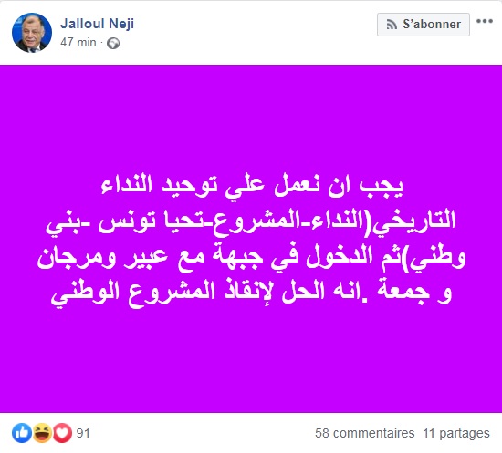 Le leader au sein de Nidaa Tounes et directeur général de l’ITES, Neji Jalloul a publié sur sa page Facebook la recette qu’il voit comme l’unique moyen de sauver le projet national en Tunisie.