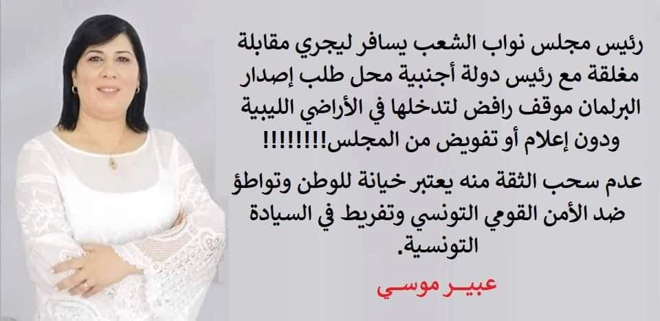 La présidente du parti destourien libre, Abir Moussi, a publié, sur sa page facebook, un post, dans lequel elle condamne le fait que le président du parlement se déplace en Turquie pour une réunion à huis clos avec le président turc à propos duquel l’ARP avait demandé la publication d’une décision pour lui signifier le refus de son intervention en Libye.