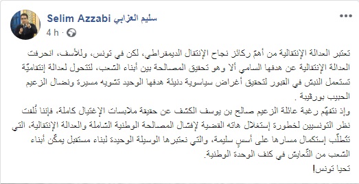 Le Secrétaire général du parti Tahya Tounes, Selim Azzabi a fait part via sa page Facebook, de sa grande appréhension dans ce sens et sa condamnation du fait qu’on utilise une soi-disant justice transitionnelle, pour salir la mémoire du leader Habib Bourguiba, à des fins politiques de bas étage. Il a fait part de ses craintes que cette déviation du processus de la justice transitionnelle n’empêche toute réconciliation nationale et ne fasse capoter le processus démocratique.