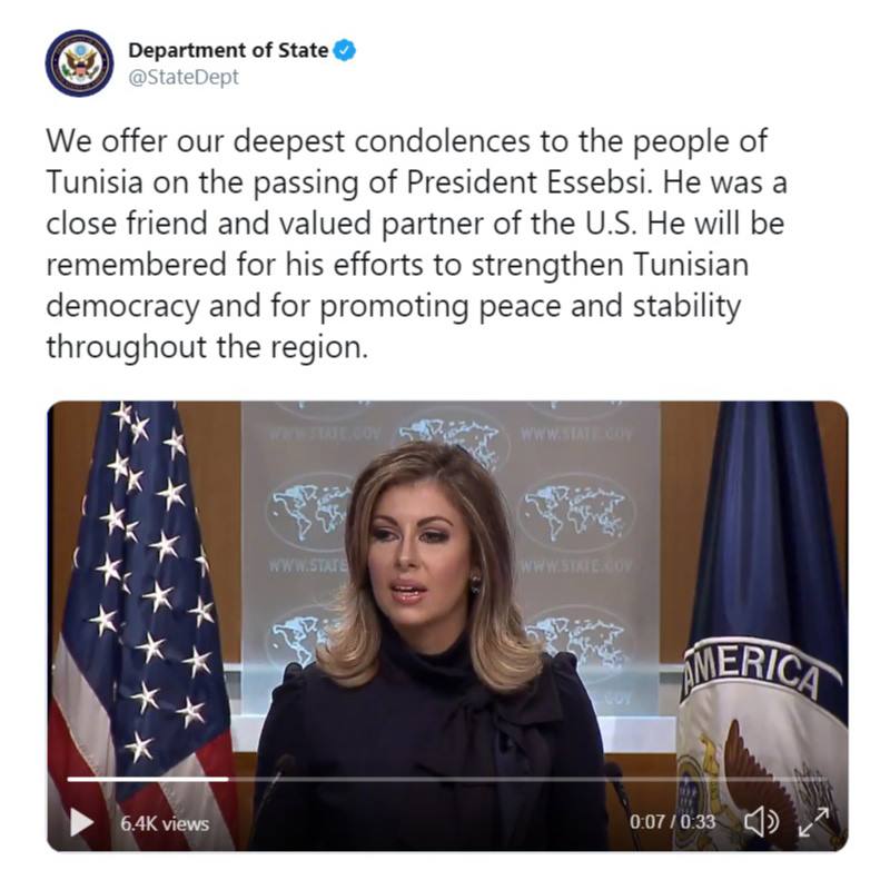 La porte-parole du département d’Etat aux USA a présenté « ses condoléances les plus attristées, au peuple tunisien, suite au décès du président Essebsi ». Elle a ajouté « qu’il était un proche ami et un partenaire de valeur pour les USA ».
