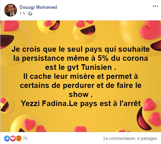 Le professeur Mohamed Douagi, réanimateur de renommé, a publié ce vendredi, sur sa page Facebook, un post dans lequel il accuse le gouvernement tunisien de vouloir faire perdurer l’histoire de l’épidémie du Coronavirus, ne serait-ce que de 5%. Il a expliqué que cette situation arrangeait certaines personnalités et leur permettait de perdurer et de continuer à faire le show.