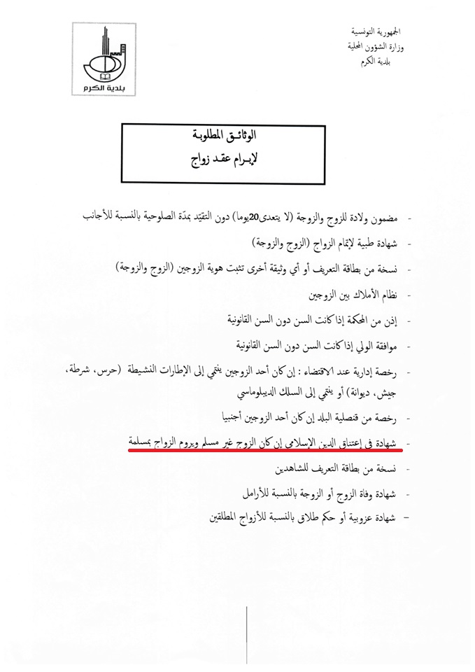 C’est ce qui apparait du document publié par la commune du Kram présidée par Fathi Laâyouni, en rapport avec les documents requis pour établir un acte de mariage. Et parmi ces documents, on retrouve le document qui avait été annulé en 2017.