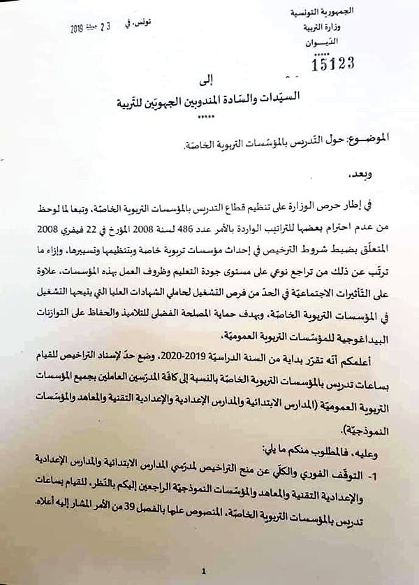 Le ministre de l’éducation Hatem Ben Salem a diffusé, ce lundi, une circulaire, pour annoncer l’interdiction à tout enseignant officiant dans un établissement public, d’assurer des cours dans les établissements d’enseignement privés.