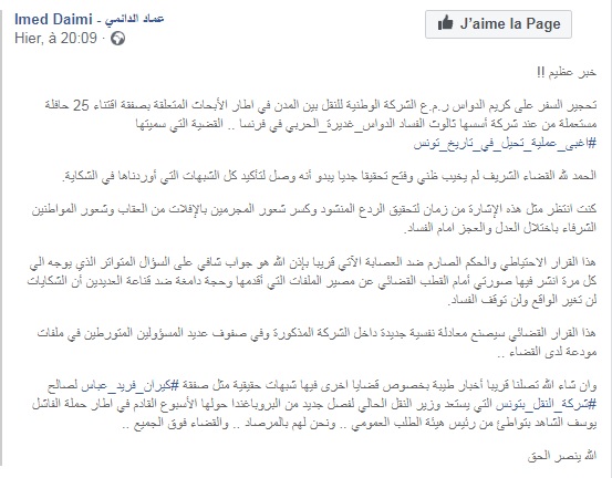 Le député Imed Daïmi a assuré sur sa page Facebook que le PDG de la compagnie TRANSTU a été interdit par la justice de quitter le territoire tunisien, suite à une plainte déposée par le député lui-même, en rapport avec l’acquisition de bus d’occasion.