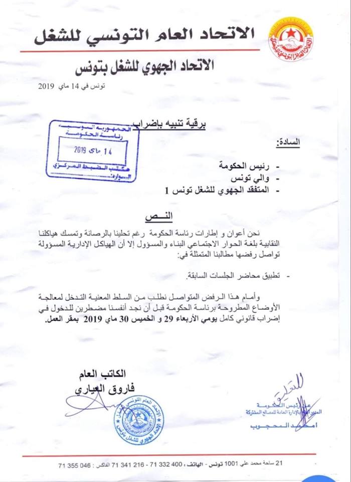 Le syndicat de base de la présidence du gouvernement, relevant de l’UGTT, a publié, ce mardi, un prévis de grève de deux jours, les 29 et 30 mai courant. Et ce, devant le refus de l’autorité de tutelle de respecter ses engagements qui ont fait l’objet d’anciens procès verbaux.