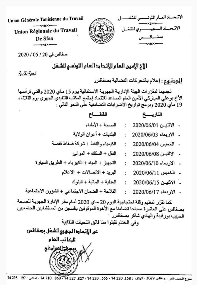 Le bureau régional de l’UGTT à Sfax a publié, ce mardi, la liste et les dates des grèves sectorielles et des protestations programmées dans la région afin de revendiquer la libération des personnels soignants arrêtés dans le cadre de l’affaire de l’agression du député Mohamed Affes.