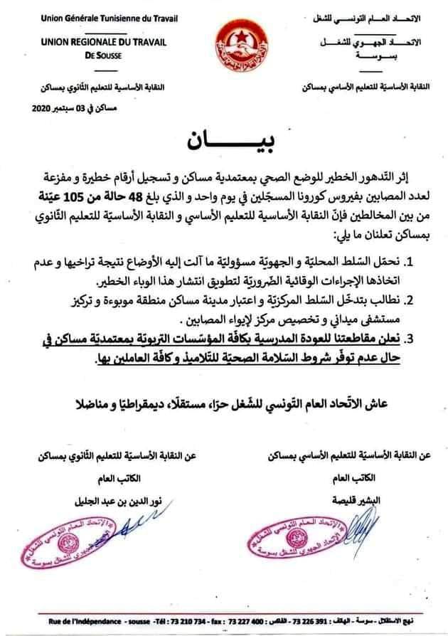 Les syndicats de l’enseignement à Msaken ont accusé, dans un communiqué publié ce vendredi, les autorités locales de négligence ayant conduit à la détérioration de la situation épidémiologique dans la ville.