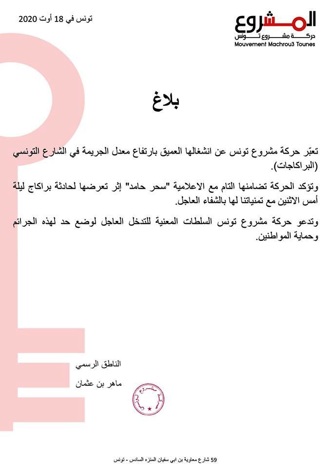 Le parti Machrou3 Tounes a publié, ce mardi, un communiqué dans lequel il déplore la dégradation de la sécurité en Tunisie et la multiplication des crimes comme les braquages. Le parti annonce son soutien à la journaliste de RadioMed qui a été victime, hier, d’un braquage violent, et appelle les autorités à réagir fermement pour mettre fin à cette situation.