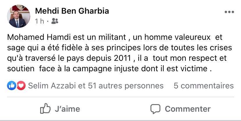 Mehdi Ben Gharbia a pris sa défense via un poste facebook et a exprimé son soutien pour son ami.