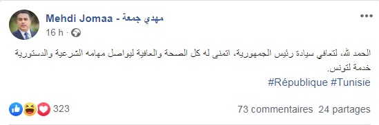 Le président du parti Al Badil, et ex-chef du gouvernement tunisien, Mehdi Jomaâ, a publié sur sa page facebook, un post dédié au président de la République, Béji Caïed Essebsi, pour se féliciter de son rétablissement, et lui souhaiter une bonne santé pour qu’il continue à remplir ses charges constitutionnelles et légitimes.