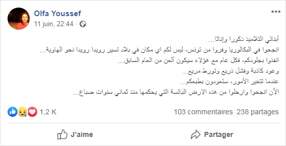 C’est en ces termes, on ne peut plus pessimistes, que l’universitaire Olfa Youssef s’est adressée, à travers sa page Facebook, aux élèves qui ont commencé, depuis hier, les épreuves du baccalauréat. Elle les a exhortés à réussir leur bac et à se sauver de ce triste pays, qui va lentement mais surement vers l’abîme. Elle leur a expliqué que « chaque année qu’ils passeront en Tunisie sera pire que la précédente, avec cette gente qui gouverne le pays et ses mensonges et échecs successifs ».