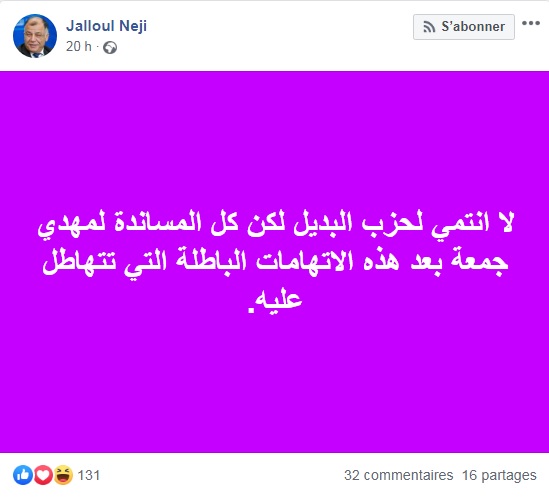 Neji Jalloul, directeur général de l’institut tunisien des études stratégiques, a annoncé ce samedi, à travers sa page Facebook, que bien qu’il ne fasse pas partie d’Al Badil, cela ne l’empêche pas de dire toute sa solidarité avec Mehdi Jomaâ président d’Al Badil, devant le flot d’accusations calomnieuses qui le ciblent depuis quelques temps.