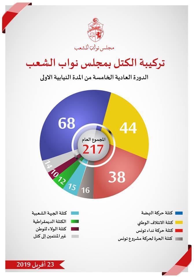 Suite à la démission des députés Faouzia Ben Fodha, Abdelkader Ben Dhifallah et Kamel Hraghi du bloc parlementaire Nida Tounes, mardi 23 avril 2019, la composition des blocs parlementaires devient la suivante :