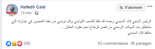 Le fils du président, Hafedh Caïd Sebsi a publié un statut Facebook à travers lequel il a annoncé que tous les citoyens auront le droit d’assister aux funérailles du président de l’Etat.