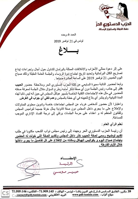 La présidente du PDL, Abir Moussi, a adressé au président de l’ARP, Rached Ghannouchi, un courrier, pour demander des explications concernant la présence dans une réunion restreinte des représentants des partis à l’assemblée, sans qu’il en ait le droit, vu qu’il n’est pas élu, dans cette législature.