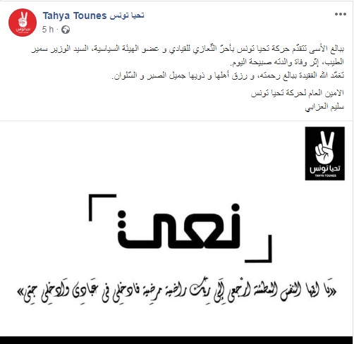 Le secrétaire général du parti Tahya Tounes, Slim Azzabi, a présenté, au nom du parti, u ministre de l’agriculture, Samir Ettaïeb, ses condoléances suite au décès de sa mère.