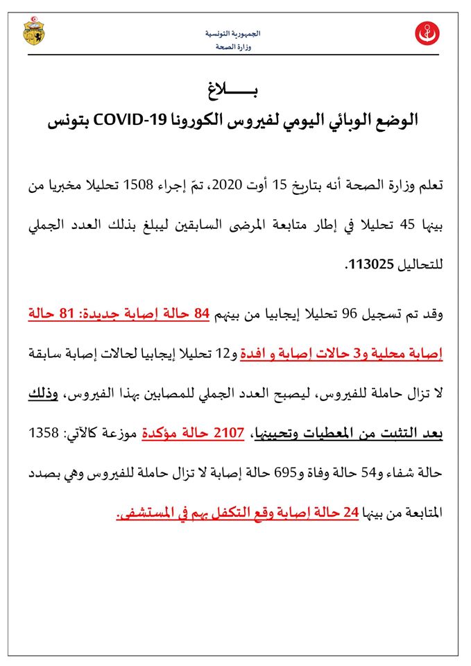 Le ministère de la Santé a fait savoir, ce dimanche 16 août 2020, que sur les 1508 tests de dépistage effectués dont 45 analyses dans le cadre du suivi d’anciens patients, 96 se sont avérées positives au Coronavirus, dont 84 nouveaux cas (81 locaux) et 12 analyses positives d’anciens cas encore porteurs du virus. Ainsi, le nombre des analyses effectuées depuis le début de la crise sanitaire s’élève à 113025.