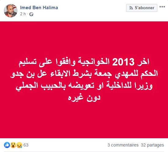 La dernière déclaration est celle de l’avocat Imed Ben Hlima, qui a tenu à rappeler, via un post sur sa page Facebook, qu’au moment de la prise de fonctions du gouvernement de Habib Essid, en 2013, les islamistes d’Ennahdha ont exigé le maintien en poste du ministre de l’Intérieur, Ben Jeddou ou à défaut, de le replacer par Habib Jemli et que leur exigence n’était négociable !