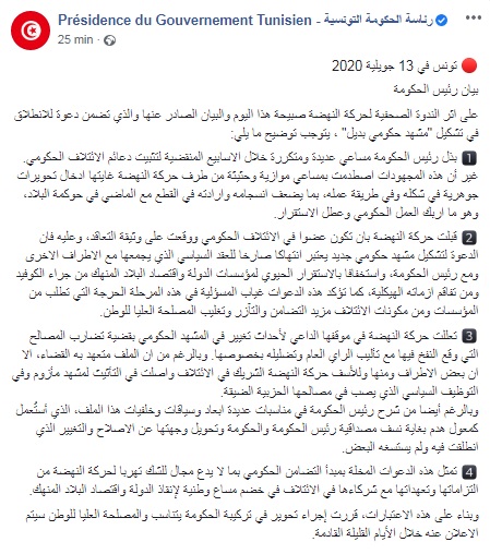 Pour toutes ces raisons, et pour l’insistance d’Ennahdha pour se retirer de ses engagements en matière de cohésion gouvernementale, le chef du gouvernement a annoncé qu’il va procéder, dans les heures qui viennent un remaniement ministériel dans le sens de préserver les intérêts suprêmes de l’Etat.