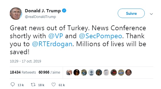 À l’issue des pourparlers entre Mike Pence et Recep Tayyip Erdogan, ce jeudi 17 octobre à Ankara, Donald Trump a remercié, sur son compte Twitter, le Président Turc.