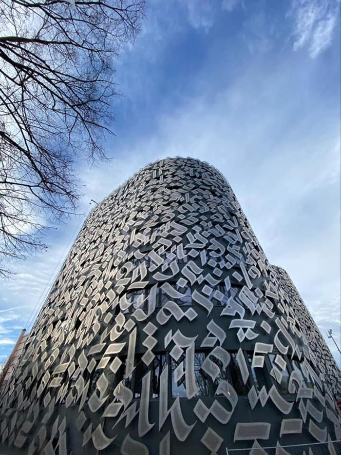 Pour ce bâtiment dédié à l’hébergement d’étudiants et chercheurs tunisiens, nous avons choisi les lettrages de l’artiste tunisien Shoof (HosniHertelli) et nous avons confié au designer Wissem Soussi de concevoir une double peau en aluminium revêtant tout le bâtiment. Le résultat est très beau en photo, mais époustouflant en réalité.