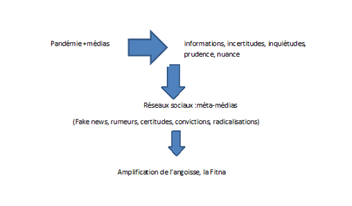 La combinaison de la pandémie du Covid19 (inconnue, invisible, dévastatrice, demande urgente de solution, de vaccin) , de la sur-médiatisation mondiale et d’une consommation médiatique excessive sans esprit critique, émotionnelle, sans distance engendre immanquablement pathos, peur, angoisse, traumatisme, et toute une kyrielle d’effets nocebos . et par voie de conséquence, l’intervention des réseaux sociaux va s’emparer de cette angoisse et s’immiscer dans les failles de l’information afin d’y injecter des Fake news et des rumeurs infondées et invérifiables et ce, dans le but d’amplifier l’angoisse, et d’instaurer un climat de Fitna et de chaos.