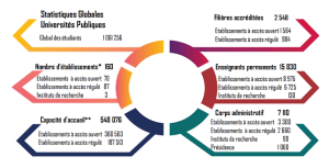 La capacité d’accueil globale en termes de places physiques dans les universités marocaines est de 548.076 dont 360.563 places pour les établissements à accès ouvert et 187.513 pour les établissements à accès régulé. A noter que l’année précédente, cette capacité était de 521.187 places dont 349.184 pour les établissements à accès ouvert et 172.003 pour les établissements à accès régulé. Parmi les universités qui ont les plus grandes capacités d’accueil figure en tête l’Université Ibn Zohr d’Agadir avec une capacité de 80.675 places. On retrouve ensuite l’Université Hassan II de Casablanca (69.885 places), l’Université Sidi Mohammed Ben Abdellah (60.962), l’Université Mohammed V (58.488), Cadi Ayyad de Marrakech (48.158,), Moulay Ismail (45 598). Enfin, il est à noter que le nombre global d’établissements s’élève à 160 au niveau national dont 70 à accès ouvert, 87 à accès régulé et 3 instituts de recherche.