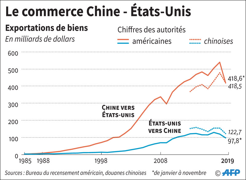 - En 2019, des marchandises chinoises d’un montant de 418,5 milliards de dollars (-12,5%) ont traversé la frontière américaine, contre 122,7 milliards (-20,9%) dans l’autre sens, selon l’Administration chinoise des douanes.
