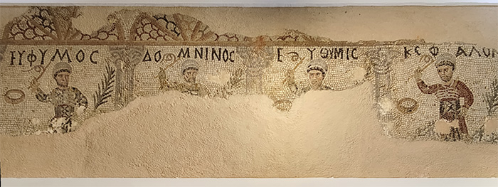 Les canthares et les raisins, thèmes bachiques par excellence, ont connu aussi de beaux jours dans l’art chrétien comme symboles eucharistiques. Ainsi, on a là des exemples de continuité et de survivance culturelles malgré le changement religieux, d’une réadaptation forcée de l’Eglise à des symboles fort ancrés dans le subconscient des gens, et ce, au moyen de réinterprétations. Les mosaïques exposées à l’extérieur du musée reprennent le thème du canthare et versent aussi dans la préférence du répertoire de l’époque pour le cloisonnement des volatiles représentés de profil et des fleurs dans de petits médaillons, évitant ainsi d’avoir à souffrir des soucis de la perspective et des proportions. Ces petits clichés où ne figurent pas d’animaux agressifs sont une métonymie de l’ambiance paradisiaque où règnent la félicité et la paix.
