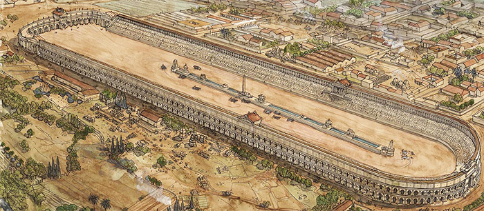 Les fouilles de cet édifice presque disparu sont restées partielles par rapport à ses dimensions. Parmi les découvertes majeures, il y a eu celles de chapiteaux corinthiens en marbre blanc qui ont couronné la colonnade qui a coiffé les gradins de l’édifice au milieu du IIe s. et dont un spécimen est exposé ici. Ces mêmes fouilles ont mis au jour des tablettes de malédiction en plomb (tabellae defixionis) qui ont été enterrées dans la piste du cirque par les auriges, les propriétaires des chars, les fans, pour maudire les concurrents ou les chevaux rivaux et leur jeter un mauvais sort pour leur faire échouer la course. Ces rouleaux en plomb – il y en avait certainement d’autres en matières périssables comme le papyrus -, à contenu magique, ont été rédigés et dessinés par des sorciers professionnels qui avaient pignon sur rue.