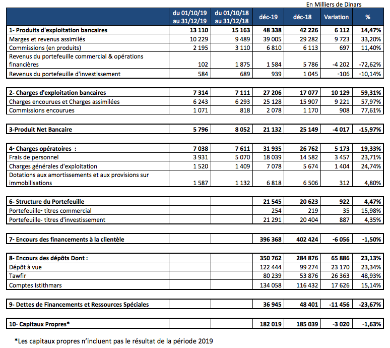 Cette situation a causé une baisse de 16% du Produit Net Bancaire qui s’établit à 21,1 millions de dinars en 2019, contre 25,1 millions une année auparavant.