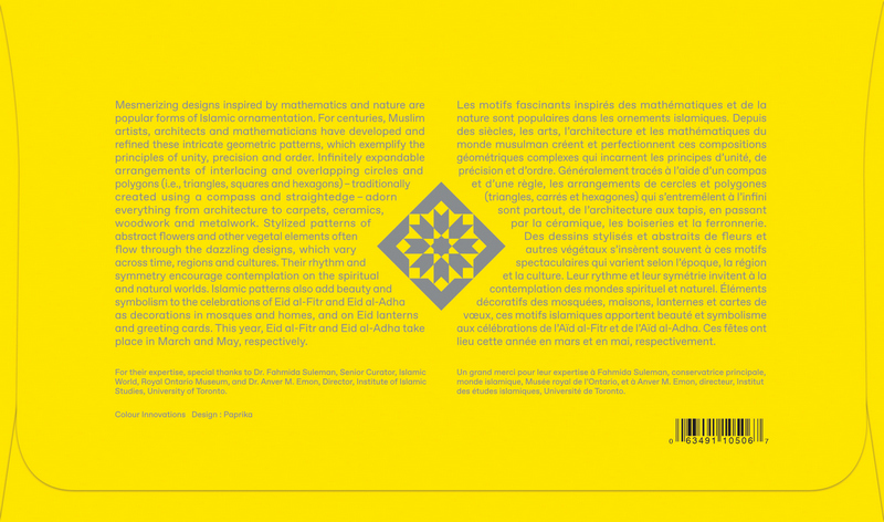 Cette émission de timbres a été conçue par Paprika et imprimée par Colour Innovations. Elle comprend un carnet de six timbres PermanentsMC au tarif du régime intérieur et un pli Premier Jour officiel oblitéré à Vancouver, en Colombie-Britannique, où vit une population musulmane vaste et diversifiée.