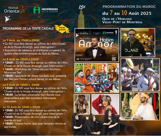 Pour sa 15e édition, le Festival Orientalys se tiendra du 7 au 10 août 2025 au Quai de l’Horloge du Vieux Port de Montréal, mettant en lumière une programmation marocaine exceptionnelle grâce à Hespérides Arts et Cultures. Cet événement promet d’offrir une immersion dans la richesse culturelle et artistique du sud du Maroc, tout en soulignant nos valeurs en tant qu’OBNL, telles que l’hospitalité, le dialogue, le partage et le vivre ensemble.