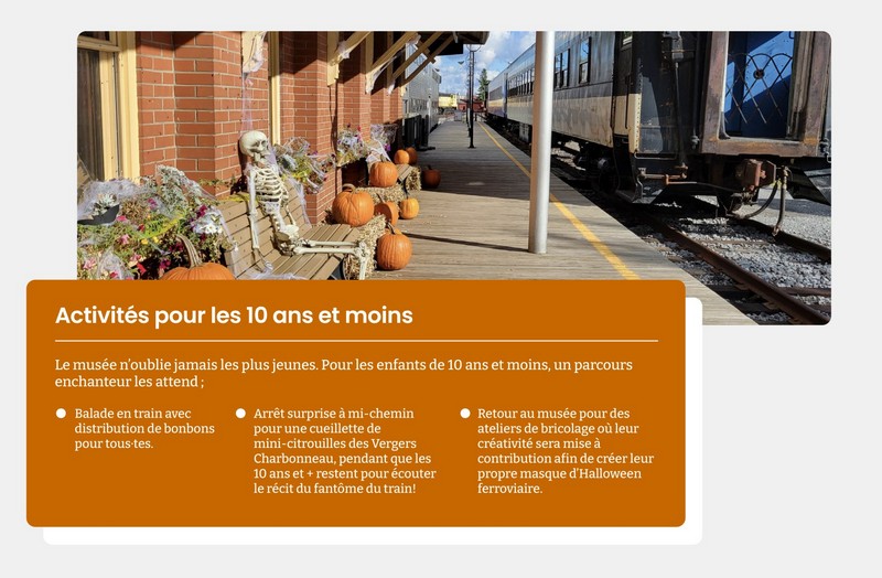 Une voiture pour les moins de 10 ans : distribution de bonbons à bord cueillette de mini-citrouilles à mi-balade une fois rendus à la gare de la Montée des Bouleaux, offerte par Le Verger Charbonneau qui proposera également un kiosque avec leurs produits gourmands la fin de semaine des 25 et 26 octobre.