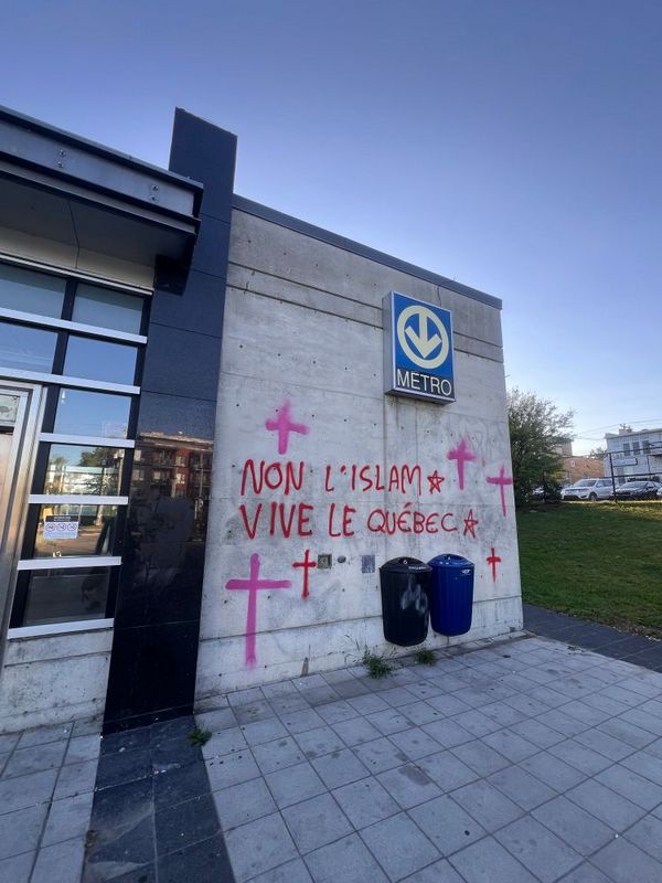 Lundi dernier, j’ai été stupéfait de voir cet énorme graffiti raciste et islamophobe sur l’édicule Est de la station de métro Cartier. J’ai rapidement dénoncé cette situation à la STM, leur demandant d’effacer au plus vite ce message haineux. Car c’en est un, un message chargé de haine. À la vue de ce graffiti, j’ai ressenti une agression, une intimidation très violente, une volonté brutale d’exclusion des concitoyens et des concitoyennes de confession musulmane. C’est sûrement le but d’un tel geste : intimider.