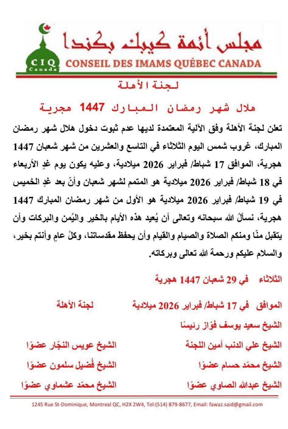 Selon Muslim Association of Canada, le mois de Ramadan débutera le 18 février 2026, alors que selon le Conseil des Imams Québec le premier jour de Ramadan sera le 19 février 2026.